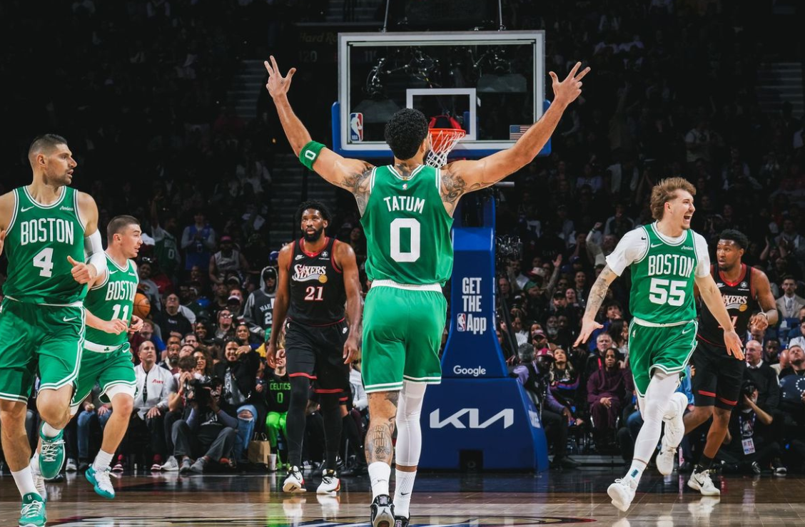 中段普理查德捡漏上篮,乔治和普理查德对飙三分,普理查德联合塔图姆带队打停76人,马克西三分止血后,谢尔曼和沃尔什继续外线轰炸,节末普理查德继续军训恩比德,第一节绿军34-18领先76人。进入第二节,两队僵持几分钟,布朗的底角三分球打破僵局,随后普理查德和格莱姆斯外线对狙,普理查德弹无虚发,格莱姆斯反击迎面劈扣布朗!中段豪泽和怀特也下起三分雨,马克西和乌布雷单打艰难追分!后半段加尔扎迎着恩比德继续外线输出,乔治和恩比德止血后,布朗内外开花,半场结束时,绿军56-38领先。