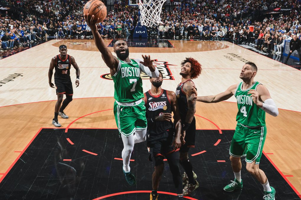 中段普理查德捡漏上篮,乔治和普理查德对飙三分,普理查德联合塔图姆带队打停76人,马克西三分止血后,谢尔曼和沃尔什继续外线轰炸,节末普理查德继续军训恩比德,第一节绿军34-18领先76人。进入第二节,两队僵持几分钟,布朗的底角三分球打破僵局,随后普理查德和格莱姆斯外线对狙,普理查德弹无虚发,格莱姆斯反击迎面劈扣布朗!中段豪泽和怀特也下起三分雨,马克西和乌布雷单打艰难追分!后半段加尔扎迎着恩比德继续外线输出,乔治和恩比德止血后,布朗内外开花,半场结束时,绿军56-38领先。